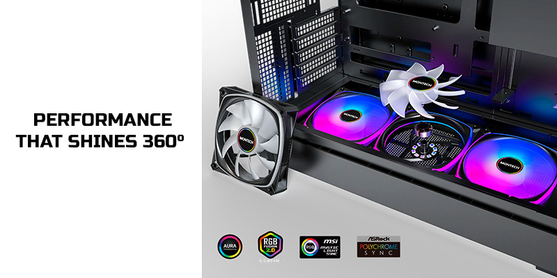 Bộ quạt đi kèm gồm 3 quạt RX120 PRO ở đáy và 1 quạt AX120 PRO phía sau, được thiết kế với cánh quạt hiệu suất cao, tăng 10% lưu lượng gió, giúp duy trì nhiệt độ lý tưởng cho GPU và CPU. Đồng thời, hiệu ứng ánh sáng ARGB 360° mang lại trải nghiệm thị giác sống động, dễ dàng đồng bộ với hệ thống thông qua các phần mềm điều khiển ánh sáng phổ biến, giúp dàn PC của bạn nổi bật trong mọi không gian.