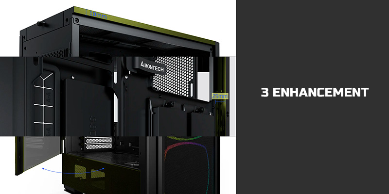 Montech SKY TWO GX không chỉ đẹp và mạnh mẽ, mà còn cực kỳ tiện dụng. Với thiết kế nắp kính dạng bản lề, người dùng có thể mở case nhanh chóng mà không cần tháo rời ốc vít. Phần mặt bên dưới có thể tháo rời bằng 2 vít phía sau, giúp việc vệ sinh bụi trở nên đơn giản hơn bao giờ hết. Ngoài ra, không gian đi dây được mở rộng thêm 5mm, nâng tổng chiều rộng quản lý cáp lên 25mm, giúp đi dây gọn gàng hơn và tăng tính thẩm mỹ tổng thể cho hệ thống.