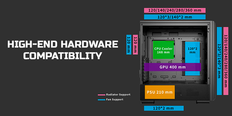 Montech SKY TWO GX Black có khả năng tương thích với nhiều cấu hình cao cấp, hỗ trợ card đồ họa dài đến 400mm, tản nhiệt CPU cao 168mm và nguồn điện dài đến 210mm, phù hợp với các mẫu RTX 4090 hoặc tản khí lớn như Noctua NH-D15. Không chỉ hỗ trợ radiator 360mm ở cả mặt trên và mặt trước, SKY TWO GX còn hỗ trợ gắn tối đa 11 quạt cùng lúc để đảm bảo luồng khí luôn lưu thông tốt nhất. Bên cạnh đó, khả năng lắp 2 ổ cứng 3.5” và 6 ổ SSD 2.5” giúp người dùng thoải mái lựa chọn phương án lưu trữ theo nhu cầu cá nhân mà không lo giới hạn không gian.