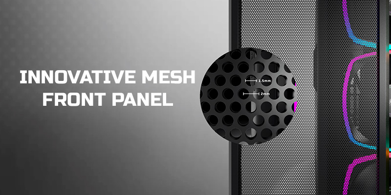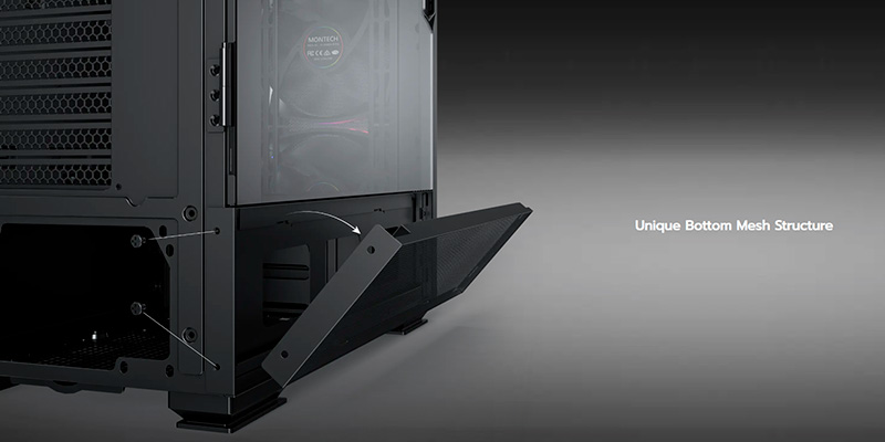 Case máy tính Montech SKY TWO GX Black CASKYTWOGXBLMT được nâng cấp mạnh mẽ về khả năng tản nhiệt với mặt trước lưới kim loại cao cấp, giúp đạt độ thoáng khí lên đến 51% đồng thời vẫn đảm bảo khả năng chống bụi tối ưu. Đây là điểm cải tiến rõ rệt so với các thế hệ trước, hỗ trợ hiệu quả cho các cấu hình sử dụng phần cứng cao cấp với TDP ngày càng lớn. Thiết kế này không chỉ nâng cao hiệu năng tản nhiệt mà còn tạo nên vẻ ngoài mạnh mẽ, đậm chất gaming cho bộ máy. Cấu trúc lưới trải dài từ mặt trước đến đáy máy giúp đẩy luồng gió mát đến toàn bộ linh kiện bên trong, kể cả khu vực nguồn, vốn thường bị hạn chế lưu thông khí.