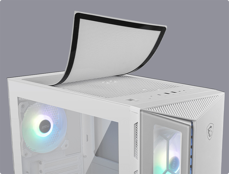 Lưới lọc bụi từ tính Case máy tính MSI MPG GUNGNIR 110R WHITE được trang bị một lưới lọc bụi từ tính được lắp đặt phía trên vị trí thoát khí của thùng máy ngăn cho bụi rơi vào làm hư hỏng bên trong. Đặc biệt, miếng lưới lọc này rất dễ dàng tháo ra khi vệ sinh, giúp case máy tính của bạn luôn trong tình trạng sạch sẽ. |