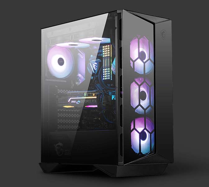 Trang bị mặt kính cường lực Case máy tính MSI MPG GUNGNIR 110R trang bị mặt kính cường lực bên hông để show khả năng ấn tượng cùng hiệu năng tuyệt vời cũng như đèn nền ARGB. |