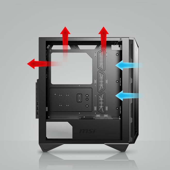 Tối ưu luồng gió Case máy tính MSI MPG GUNGNIR 110R sở hữu sẵn 4 quạt và tối đa có thể nâng cấp lên đến 6 quạt và bộ tản Raditor để tối ưu hóa luồng không khí bên trong, giúp các chi tiết mát hơn và có được độ bền tốt nhất. |