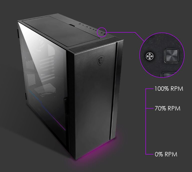 Tùy chỉnh tốc độ quạt Case máy tính MSI MPG QUIETUDE 100S có nút điều chỉnh tốc độ quạt, có khả năng cài đặt tốc độ quạt ở 100%, 70% hoặc 0% RPM tùy theo nhu cầu của bạn. |