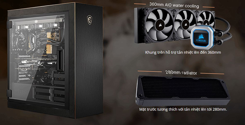 Hỗ trợ tản nhiệt nước Case máy tính MSI MPG SEKIRA 500G với không gian rộng rãi, tương thích với nhiều loại tản nhiệt nước. |