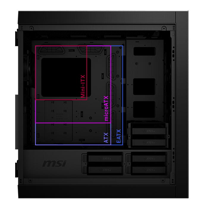 Hỗ trợ tất cả các loại bo mạch chủ Case máy tính MSI MPG SEKIRA 500G được thiết kế dễ dàng lắp đặt và hỗ trợ bo mạch chủ lên đến EATX. |