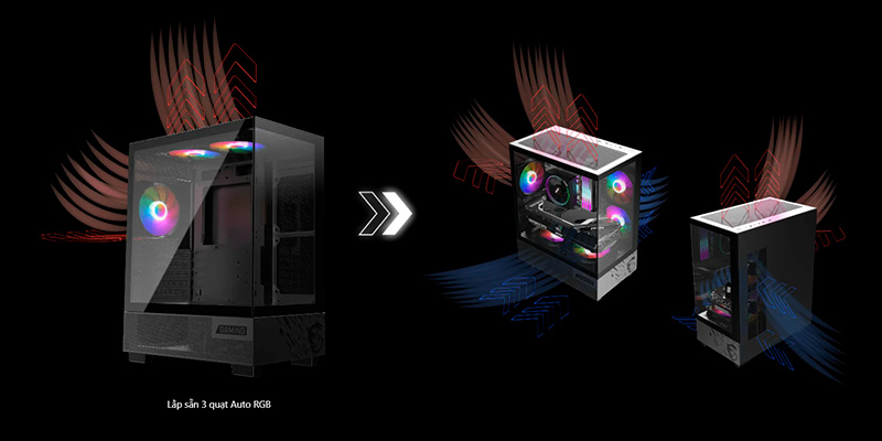 MSI PAG PANO M110A hỗ trợ đa dạng vị trí lắp quạt và radiator, giúp tối ưu luồng khí và nhiệt độ cho toàn bộ hệ thống. Case được trang bị sẵn 3 quạt Auto RGB gồm 2 quạt 120mm phía trên và 1 quạt 120mm phía sau, tạo nên hiệu ứng ánh sáng bắt mắt và lưu thông khí hiệu quả. Người dùng có thể nâng cấp thêm quạt ở hông (2 x 120mm), đáy (2 x 120mm) và mặt trên (tối đa 2 x 140mm). Ngoài ra, sản phẩm còn hỗ trợ radiator tản nhiệt nước kích thước 120mm ở phía sau và 240mm phía trên, đáp ứng tốt nhu cầu chơi game và làm việc nặng trong thời gian dài.
