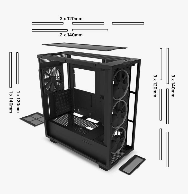 Tối ưu luồng không khí Case máy tính NZXT H7 Elite hỗ trợ gắn tối đa lên đến 7 Fan 120mm và bộ tản Raditor để tối ưu hóa luồng không khí bên trong, giúp các chi tiết mát hơn và có được độ bền tốt nhất. |