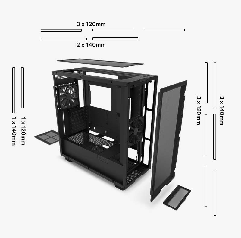 Tối ưu luồng không khí Case máy tính NZXT H7 Flow hỗ trợ gắn tối đa lên đến 7 Fan 120mm và bộ tản Raditor để tối ưu hóa luồng không khí bên trong, giúp các chi tiết mát hơn và có được độ bền tốt nhất. |