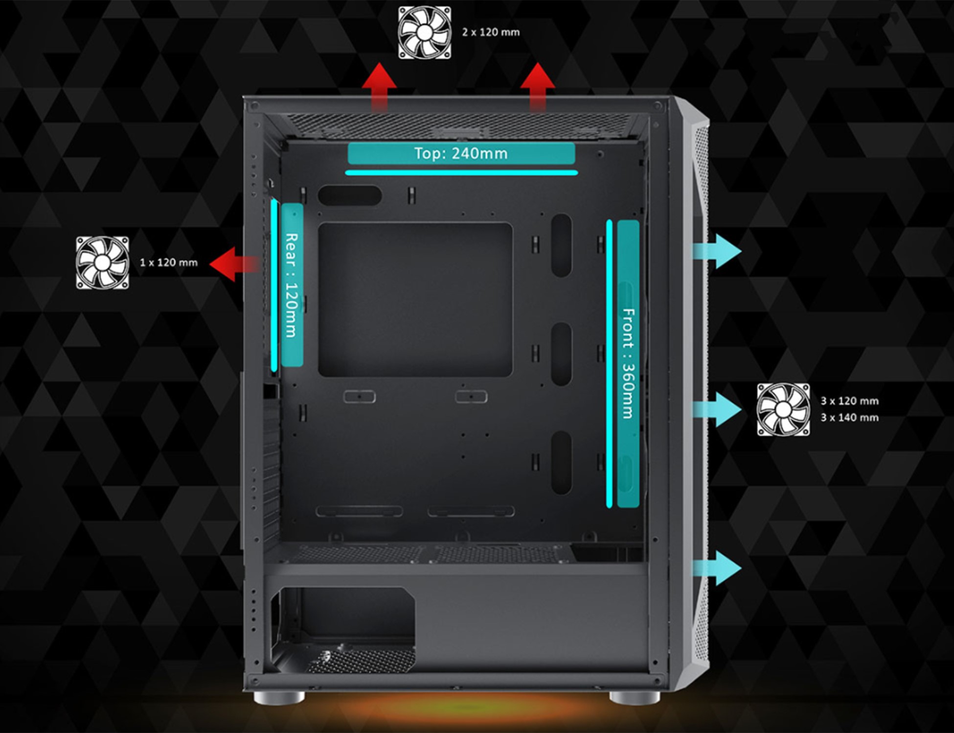 Đối lưu không khí cực tốt Case máy tính XIGMATEK Gaming X 3FX thiết kế 3 quạt hút phía trước, 2 quạt thổi ra bên trên và 1 thổi ra phía sau, đây là thiết kế tối ưu nhất giúp không khí mát đi vào và không khí nóng đi ra bên ngoài cực nhanh, tránh tình trạng dòng không khí nóng bị hút ngược lại vào bên trong. |
