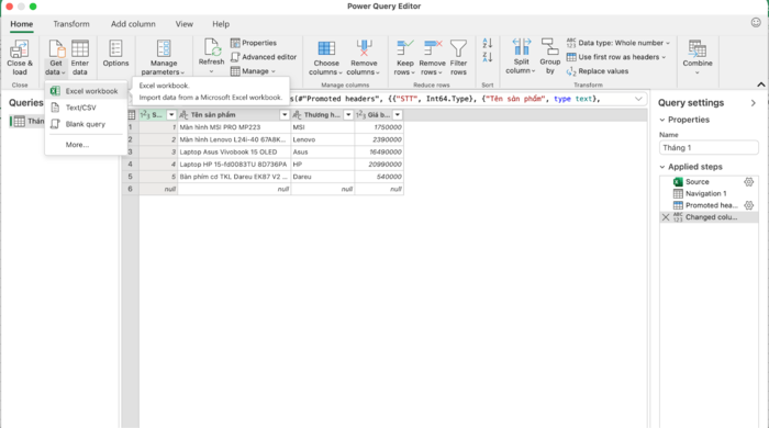 Bước 4: Để gộp nhiều file Excel thành 1 file Power Query, cụ thể là thêm tệp “Tháng 2” vào, bạn chọn Get Data → Excel Workbook.