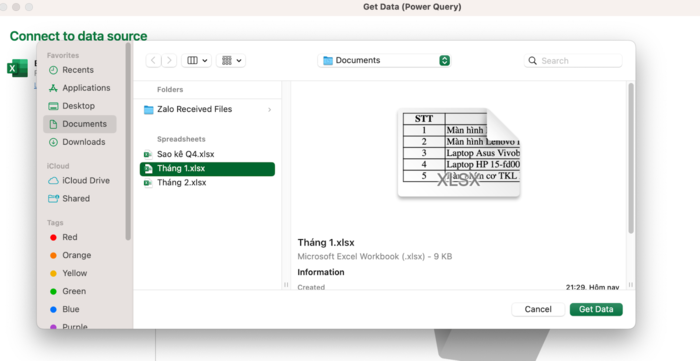 Bước 2: Tìm đến thư mục lưu trữ tệp và mở tệp “Tháng 1” → “Get Data”