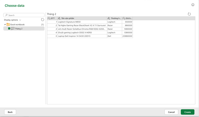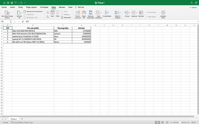 Để bắt đầu sử dụng Power Query cơ bản trên Microsoft Excel, bạn tạo trang tính Tháng 1 là những sản phẩm được bán với các trường dữ liệu là tên sản phẩm, thương hiệu và giá thành.