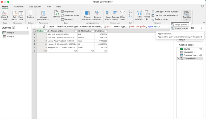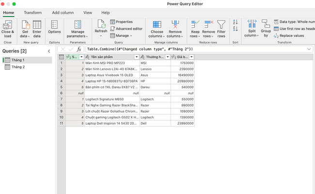 Bước 7: Để gộp tệp “Tháng 1” và “Tháng 2” lại với nhau, bạn trỏ chuột tại dữ liệu “Tháng 1” → Combine → Append Queries