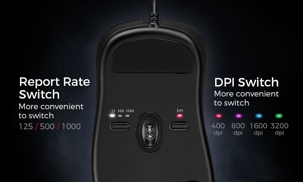 Chuyển đổi DPI cùng tốc độ báo cáo Để game thủ thuận tiện cho việc tùy chỉnh các thông số cần thiết là DPI và Polling Rate, Zowie EC Seri có 2 nút chỉnh thông số mặt dưới chuột, được hiển thị thông qua màu LED. |