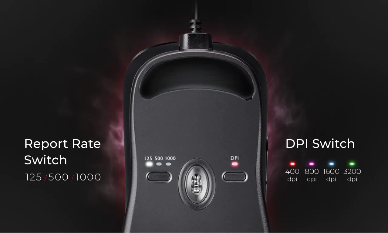 Chuyển đổi DPI cùng tốc độ báo cáo Để game thủ thuận tiện cho việc tùy chỉnh các thông số cần thiết là DPI và Polling Rate, Zowie S Seri có 2 nút chỉnh thông số mặt dưới chuột, được hiển thị thông qua màu LED. |