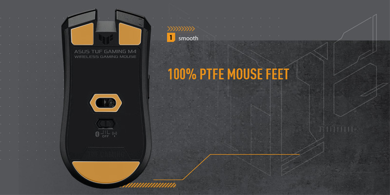 Đế chuột 100% polytetrafluoroethylene (PTFE) trên TUF Gaming M4 Wireless đảm bảo rằng nó lướt nhẹ nhàng trên mọi bề mặt bàn di chuột.
