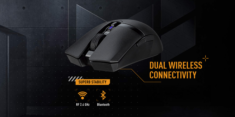 Chuột Gaming không dây Asus TUF Gaming M4 Wireless có 2 chế độ kết nối không dây vô cùng tiện lợi: 2,4 GHz và Bluetooth, mang lại kết nối ổn định tuyệt vời cho người dùng khi chơi game.