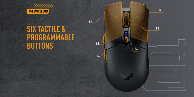 Chuột Gaming không dây Asus TUF Gaming M4 Wireless trang bị 6 nút tactile và có thể lập trình, cho phép bạn điều chỉnh các nút điều khiển cho phù hợp với phong cách chơi của mình. Các nút trái và phải được tách biệt khỏi nắp trên, dẫn đến lực tác động và khoảng cách di chuyển thấp hơn để có những cú nhấp chuột nhanh hơn và xúc giác hơn. Công tắc và chỉ báo DPI cho phép bạn điều chỉnh độ nhạy một cách nhanh chóng, trong khi hai nút bên trái được bố trí hợp lý và bánh xe cuộn có thể bấm được cung cấp các tùy chọn điều khiển bổ sung.