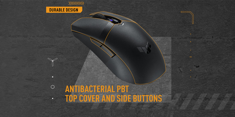 Chuột Gaming không dây Asus TUF Gaming M4 Wireless có nắp trên PBT và các nút bên hông được xử lý bằng ion bạc chống vi khuẩn. Chất liệu PBT chống mài mòn hoặc bóng, đồng thời đảm bảo cảm giác chắc chắn và độ bám chắc chắn. Bề mặt an toàn với cồn cũng cho phép bạn làm sạch bề mặt chuột mà không cần lo lắng.