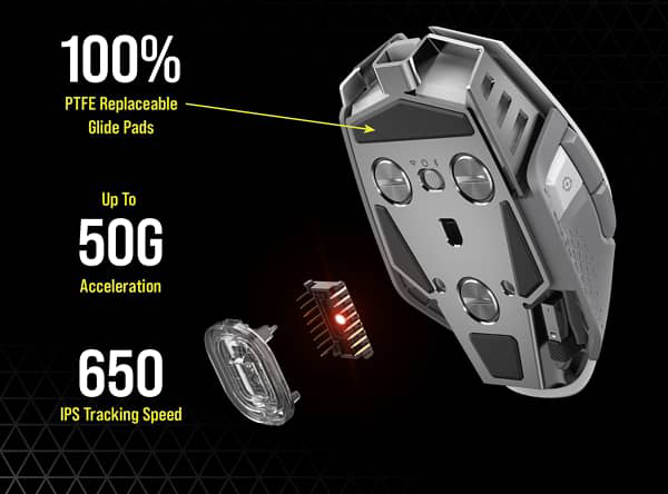 Khả năng tăng tốc Chuột Gaming không dây Corsair M65 RGB ULTRA với thiết kế công thái học mang đến cho người sử dụng sự thoải mái trong nhiều giờ liền. Ngoài ra chuột còn được trang bị miếng trượt 100% PTFE cùng thiết kế gọn nhẹ 110g mang đến khả năng chuyển động nhanh và phản xạ tức thì trong các trận chiến có nhịp độ cao. |