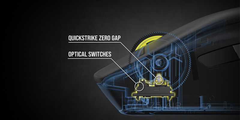 Chuột Gaming không dây Corsair M75 AIR trang bị Switch chuột quang học cho độ bền vượt trội với 100 triệu lần nhấn, chuột còn được trang bị thêm nút Corsair Quickstrike cho hành trình ngắn và khả năng nhấp nhanh, tạo ra khoảng cách giữa nút chuột và switch gần như bằng không.