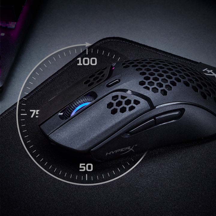 Thời lượng pin sử dụng dài Chuột Gaming không dây HyperX Pulsefire Haste Wireless trang bị pin 370mAh có thể sạc cho thời gian sử dụng lên đến 100 giờ |