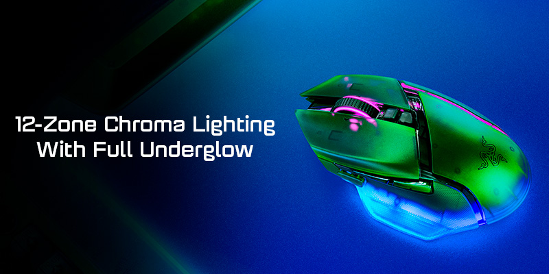 Chuột tích hợp hệ thống Razer Chroma RGB với 12 vùng phát sáng: dải đèn bao quanh phía dưới chuột, logo Razer và con lăn đều có thể được tùy chỉnh độc lập. Bạn có thể chọn hàng triệu màu sắc, các hiệu ứng động, hoặc đồng bộ ánh sáng với bàn phím, tai nghe, mousepad hay thậm chí cả game thông qua hệ thống Chroma Connect với hơn 300 tựa game tương thích. Một không gian chơi game vừa đẹp mắt vừa đồng bộ chưa bao giờ dễ thiết lập đến vậy.
