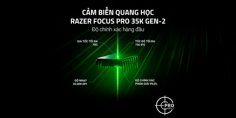 Cảm biến quang học Razer Focus Pro 35K Gen-2 được xem là chuẩn mực mới của ngành công nghiệp chuột gaming với khả năng nhận diện bề mặt vượt trội, bao gồm cả bề mặt kính mỏng từ 2mm trở lên. Với độ phân giải lên đến 35.000 DPI, tốc độ tracking 750IPS, và gia tốc tối đa 70G, chuột giúp bạn xử lý mọi pha flick shot nhanh như chớp. Đặc biệt, tính năng điều chỉnh từng bước DPI 1 đơn vị cho phép bạn tinh chỉnh chính xác đến từng pixel, rất lý tưởng cho các game thủ FPS chuyên nghiệp hoặc designer chi tiết.