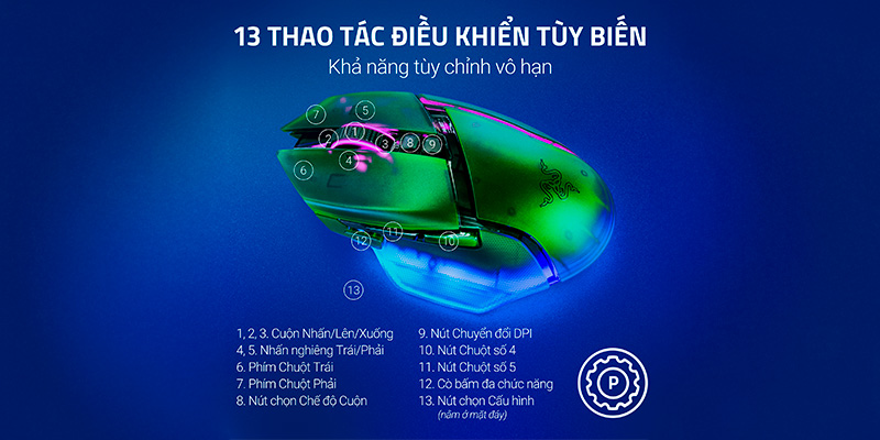 Basilisk V3 Pro Phantom Green sở hữu 13 nút có thể lập trình, bao gồm cò bấm đa chức năng đặc trưng bên hông. Với khả năng gán macro, tổ hợp phím hoặc thao tác đặc biệt qua Razer Synapse, bạn có thể truy cập nhanh các chức năng như chuyển vũ khí, ping nhanh, voice chat hoặc lệnh tắt chỉ với một lần nhấn. Ngoài ra, tính năng lưu trữ 5 profile trong bộ nhớ onboard giúp bạn mang theo cấu hình của mình bất cứ đâu mà không cần cài đặt lại.