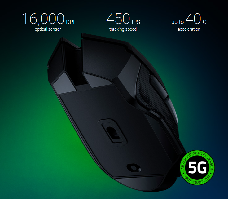 Cảm biến quang Razer 5G Được thiết kế với độ theo dõi chính xác 99,4% và độ phân giải lên đến 16.000 DPI, cảm biến trong chuột không dây này cung cấp độ chính xác và tốc độ bạn cần để luôn ở đầu bảng xếp hạng. |