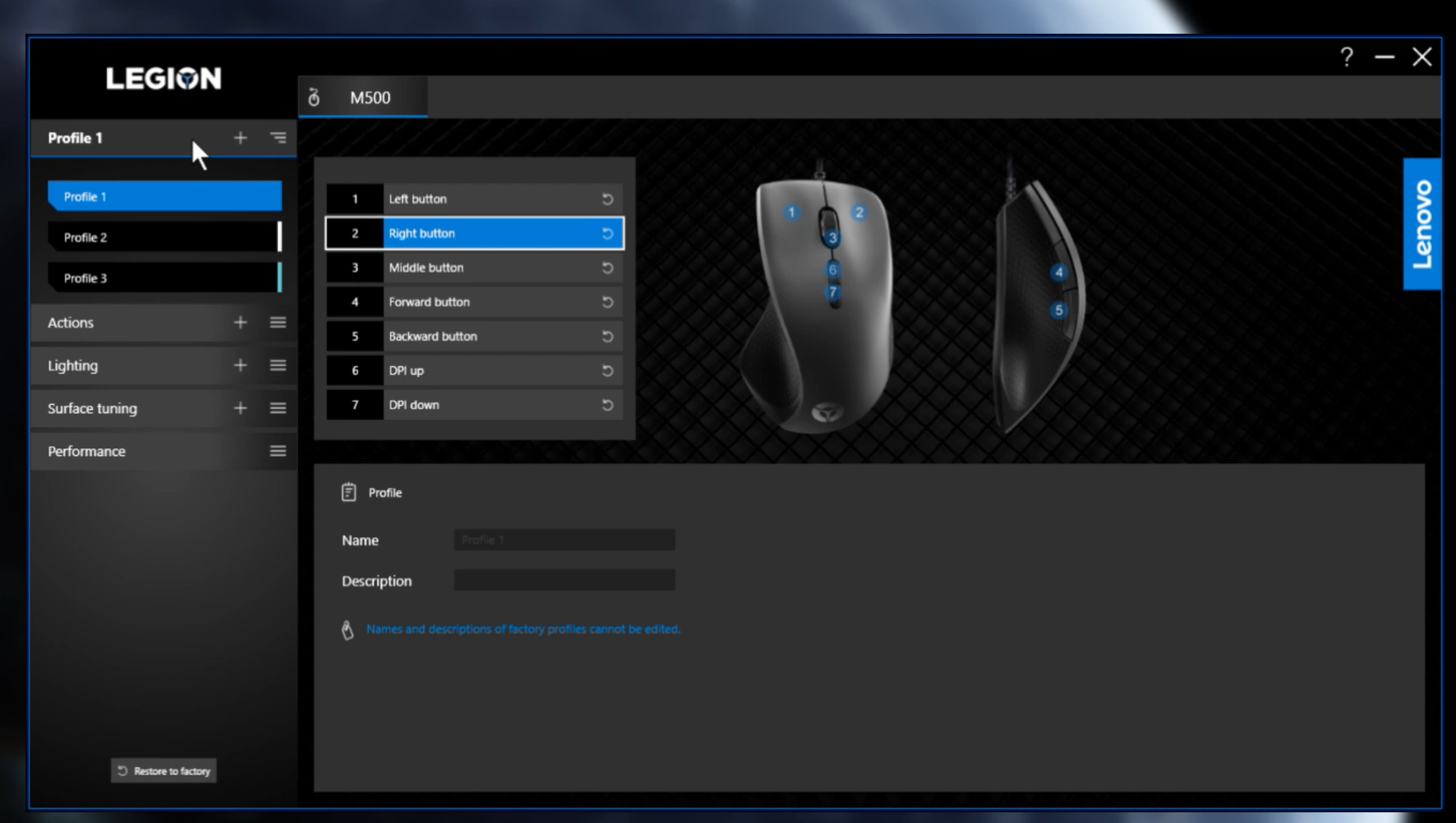 Tùy chỉnh Profile Chuột Gaming Lenovo Legion M500 RGB có thể thiết lập các chức năng như DPI, Macro, led và lưu chúng vào bộ nhớ trong để có thể sử dụng thiết lập này ở bất cứ đâu. |