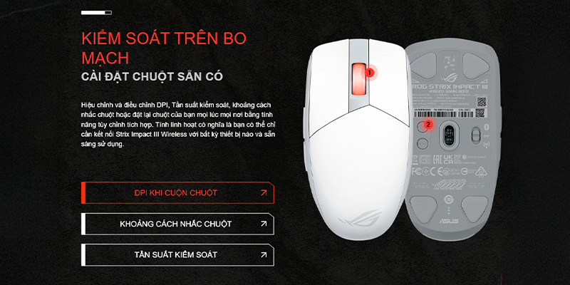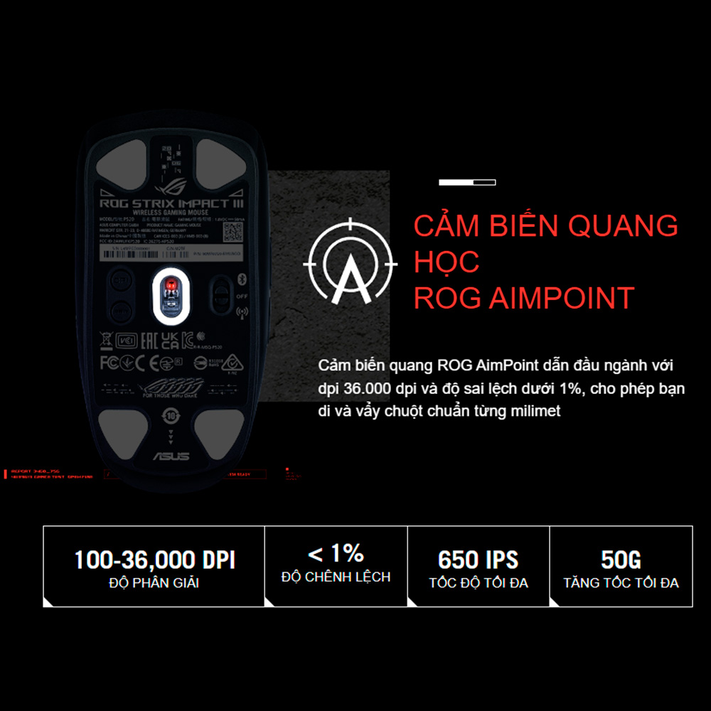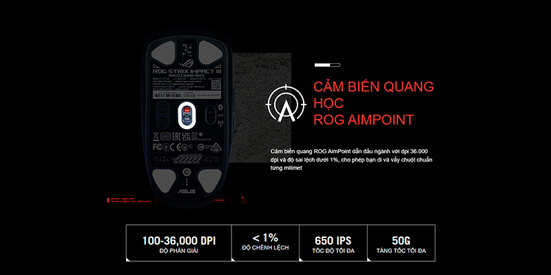 Đi sâu vào linh hồn của thiết bị, ASUS đã trang bị cho ROG Impact III Wireless mắt đọc quang học ROG AimPoint tối tân bậc nhất. Cảm biến này mang đến độ phân giải cực khủng lên đến 30.000 DPI, kết hợp cùng tốc độ lướt 650 IPS và gia tốc 50G. Những thông số dẫn đầu thị trường này cho phép chuột theo dõi mọi chuyển động tay của bạn với độ lệch chuẩn (cpi deviation) chưa tới 1%, mang lại khả năng tracking chính xác đến từng điểm ảnh (pixel-perfect) – một lợi thế mang tính sống còn trong các pha vẩy súng (flick) hay theo dõi mục tiêu.