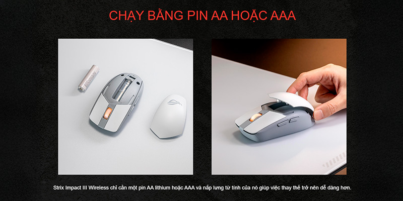 Hãng ASUS đã tính toán rất kỹ vấn đề này. Khay đựng pin của ROG Impact III Wireless được đặt ở vị trí hơi lùi về phía sau và ngay trung tâm để giữ cân bằng trọng lượng (Center of gravity).