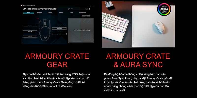 Bo mạch của ROG Impact III Wireless cung cấp 2 chế độ kết nối không dây để tối ưu hóa sự linh hoạt cho mọi nhu cầu. Khi cần chơi game try-hard, chế độ RF 2.4GHz (qua USB Dongle) sẽ mang lại tốc độ phản hồi 1ms siêu tốc chuẩn eSports. Khi mang ra ngoài làm việc với laptop, kết nối Bluetooth sẽ giúp bạn dễ dàng ghép nối mà không cần cắm đầu thu. Thông qua phần mềm Armoury Crate Gear (hỗ trợ Windows 10/11), bạn có thể dễ dàng thiết lập lại các nút bấm, tinh chỉnh mức DPI, lưu thẳng vào bộ nhớ trong (Onboard Memory) và đồng bộ hóa hiệu ứng ánh sáng Aura Sync cực kỳ tiện lợi.