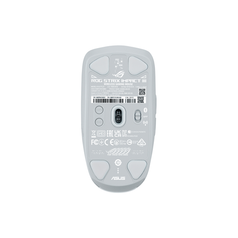 Chuột không dây ASUS ROG Impact III Wireless (White) 90MP03D0-BMUA10 thu hút ánh nhìn với tông màu Trắng (White) tinh khôi, mang đậm chất gaming hiện đại nhưng không kém phần thanh lịch. Chuột sở hữu thiết kế đối xứng (Symmetrical) cực kỳ thon gọn với kích thước 120 x 62 x 39 mm, đặc biệt lý tưởng cho kiểu cầm Fingertip (bằng đầu ngón tay) hoặc Claw grip (cầm bằng móng vuốt). Điểm ấn tượng nhất chính là trọng lượng siêu nhẹ chỉ 57g (không bao gồm pin và dongle), giúp bạn vung chuột linh hoạt, phản xạ chớp nhoáng trong các tựa game FPS nhịp độ cao mà không hề có cảm giác mỏi cổ tay sau nhiều giờ chinh chiến liên tục.