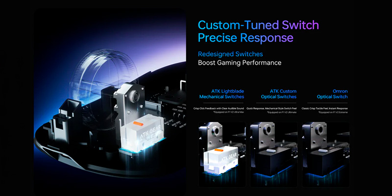 Hệ thống nút bấm của máy được trang bị Công tắc quang học ATK Custom Optical độc quyền, mang lại cảm giác click giòn giã, nảy và hành trình phím cực kỳ dứt khoát. Vì sử dụng công nghệ ngắt tia hồng ngoại để ghi nhận tín hiệu thay vì lá đồng vật lý, switch quang học này loại bỏ hoàn toàn triệt để căn bệnh "click đúp" (double-click) ác mộng.