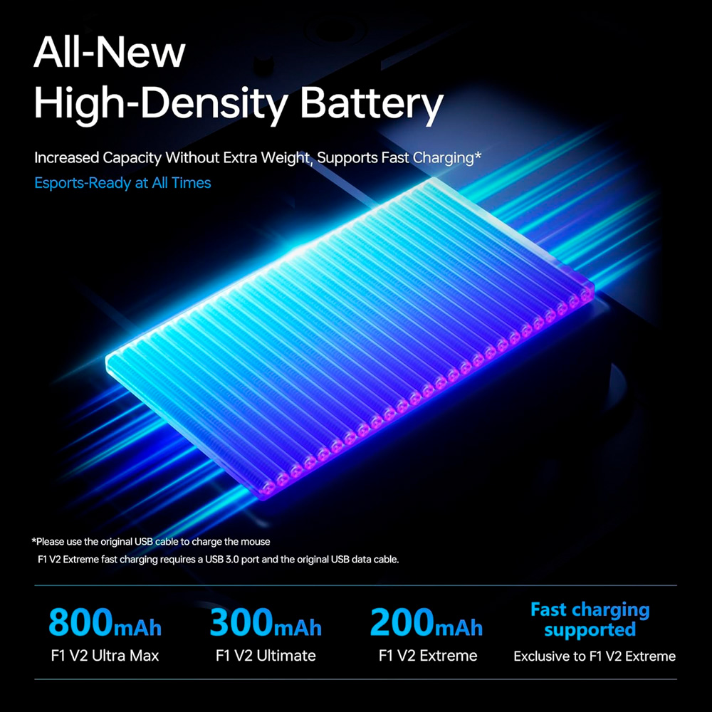 Để đạt được mức trọng lượng lông vũ 39g, ATK đã trang bị cho chuột không dây ATK Blazing Sky F1 V2 Ultimate Dual-Mode Pixart 3950 Ultra viên pin sạc dung lượng 300 mAh. Dù nhỏ gọn, công nghệ tối ưu điện năng tuyệt vời vẫn giúp chuột trụ được hơn 250 giờ sử dụng. Hộp sản phẩm cũng gây ấn tượng mạnh với độ hào phóng của nhà sản xuất khi đi kèm: 1 bộ dán chống trượt (Grip Tape) cùng màu với vỏ chuột, và tới 2 bộ feet chuột trắng cao cấp (Double-Layer Anti-Dent White Mouse Feet) để bạn thay thế, đảm bảo cảm giác lướt luôn trơn tru như mới.