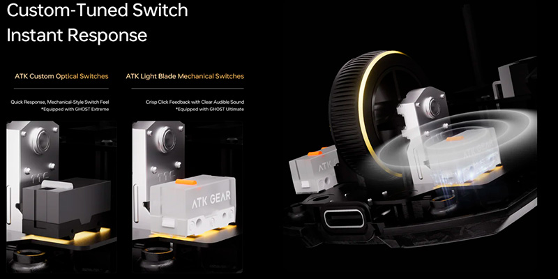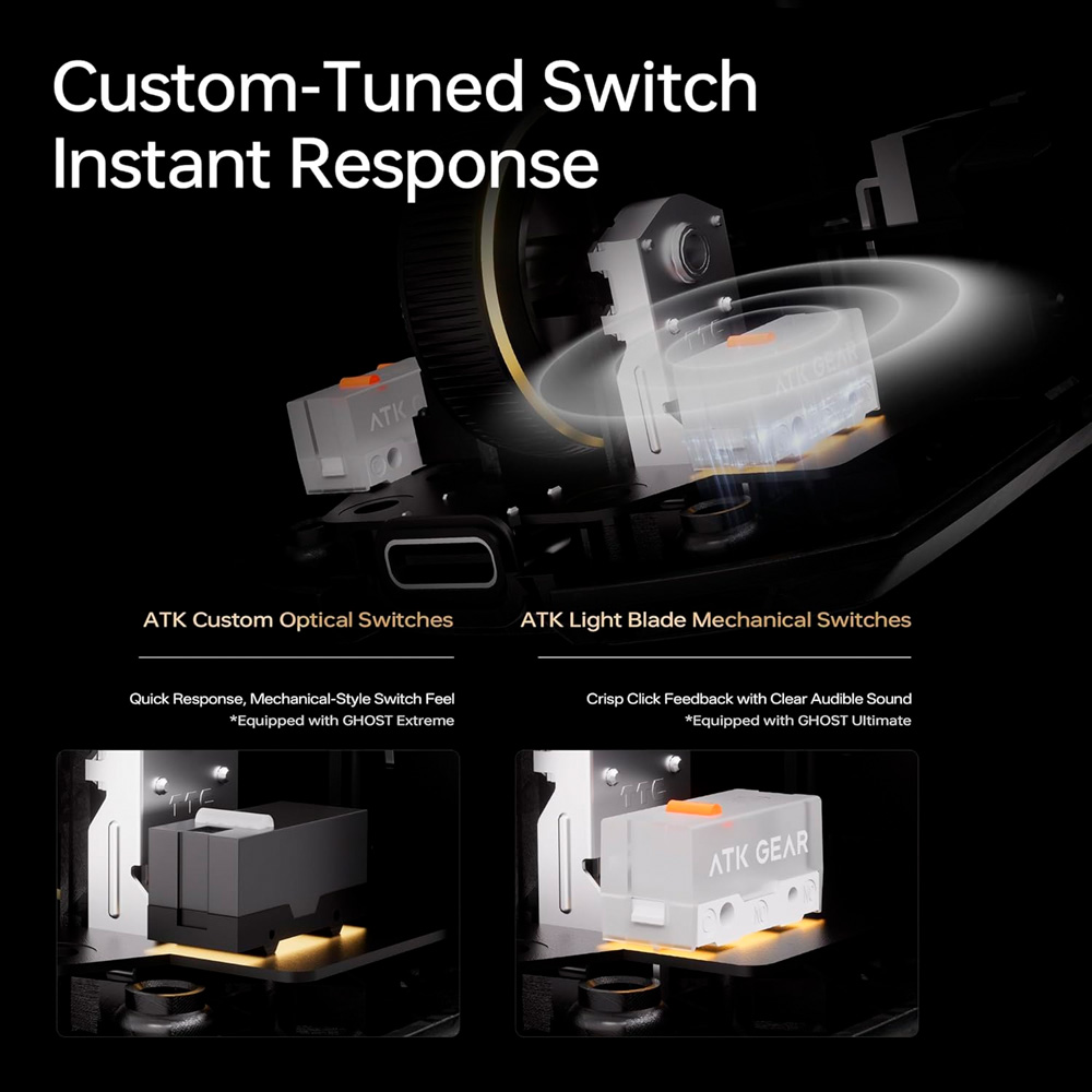 Điểm khác biệt lớn nhất của bản Extreme so với bản Ultimate chính là hệ thống nút bấm. Thay vì dùng switch cơ học truyền thống, hãng đã trang bị cho Ghost Extreme cặp Switch quang học ATK Custom Optical. Công nghệ này sử dụng tia hồng ngoại để ghi nhận thao tác click, mang lại tốc độ phản hồi ánh sáng và loại bỏ vĩnh viễn căn bệnh "click đúp" (double-click) ám ảnh giới game thủ. Cảm giác nhấn vẫn được tinh chỉnh để giữ lại độ giòn, nảy và hành trình phím cực kỳ dứt khoát.