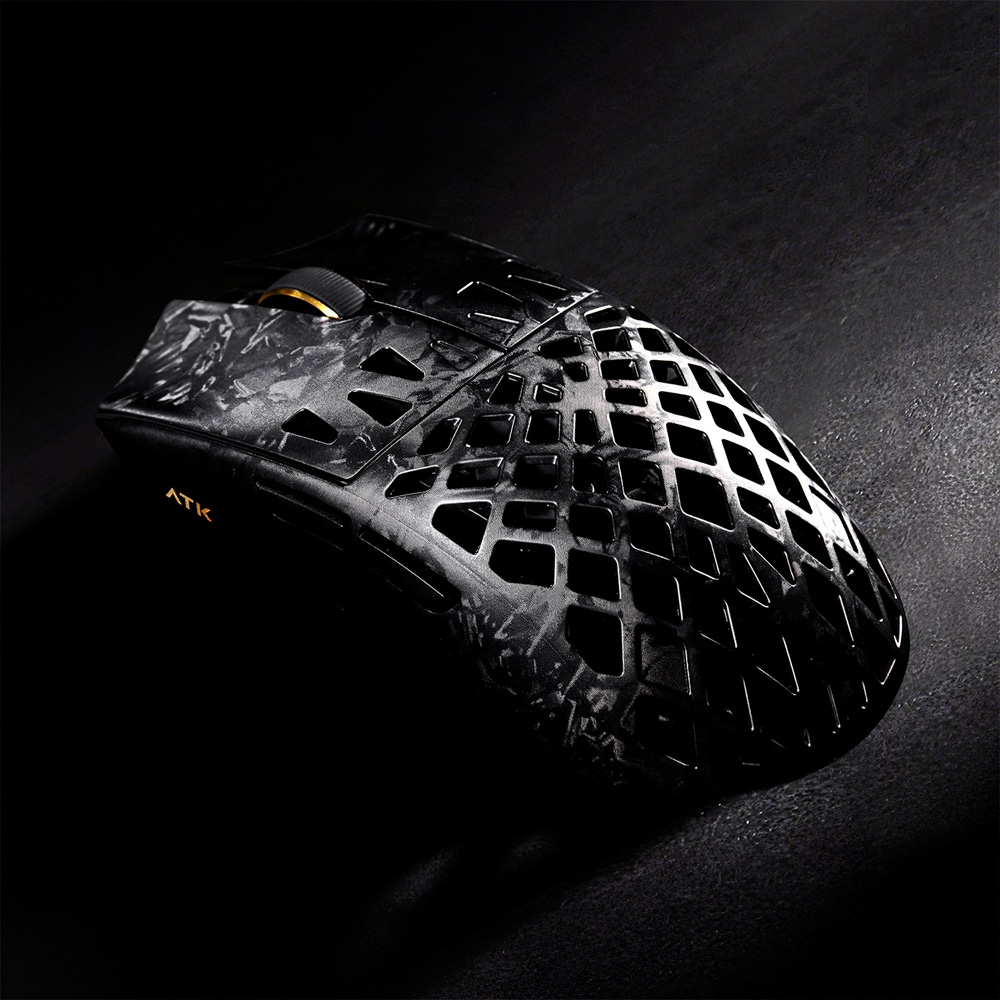 Kế thừa tinh hoa chế tác từ vật liệu hàng không vũ trụ, Chuột không dây ATK Blazing Sky Ghost Extreme Carbon Fiber Hollow Dual-mode Wireless Pixart 3950 Ultra sở hữu bộ vỏ làm hoàn toàn từ sợi Carbon (Carbon Fiber) kết hợp thiết kế đục lỗ (Hollow) cá tính. Cấu trúc này giúp chuột đạt được trọng lượng tàng hình chỉ 48g nhưng vẫn duy trì độ cứng cáp tuyệt đối, không hề bị lún hay ọp ẹp khi cầm nắm mạnh. Với kích thước đối xứng tiêu chuẩn 121 x 61.3 x 38 mm, form chuột ôm sát lòng bàn tay, hỗ trợ tốt đa dạng kiểu cầm. Phiên bản Extreme mang đến 3 tùy chọn màu sắc đậm chất viễn tưởng: Tím (Purple), Bạc (Silver) và Đen (Black).