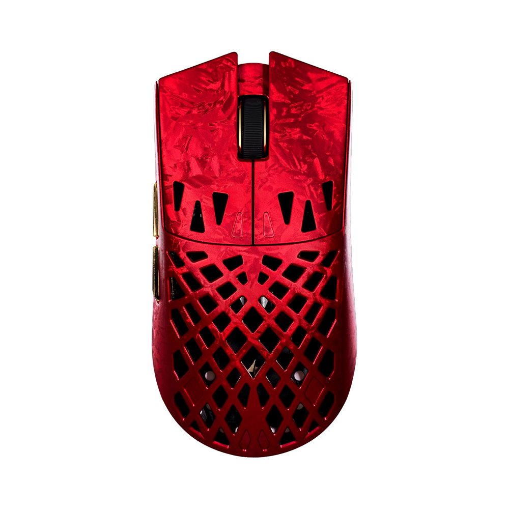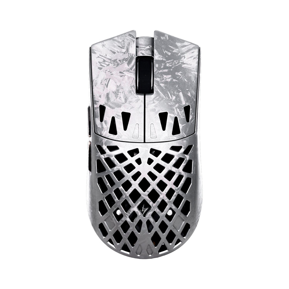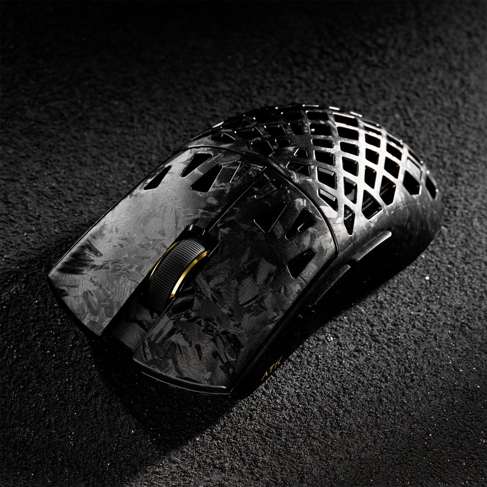 Chuột không dây ATK Blazing Sky Ghost Ultimate Carbon Fiber Hollow Tri-mode Wireless Pixart 3950 Ultra mang đến một thiết kế cực kỳ đặc biệt khi sử dụng chất liệu sợi Carbon (Carbon Fiber) vô cùng đắt giá. Kết hợp cùng ngôn ngữ thiết kế đục lỗ (Hollow) phần lưng, chiếc chuột này đạt được mức trọng lượng cực kỳ lý tưởng chỉ 48g mà vẫn giữ được bộ khung vững chãi, không hề có hiện tượng ọp ẹp (flex) khi bóp mạnh. Với kích thước đối xứng 121 x 61.3 x 38 mm, form dáng chuột ôm vừa vặn tay người dùng, kết hợp cùng các khe hở thoáng khí giúp bàn tay luôn mát mẻ trong những trận chiến căng thẳng kéo dài. Máy có 3 phiên bản màu sắc đậm chất cơ khí: Đen (Black), Bạc (Silver) và Đỏ (Red).