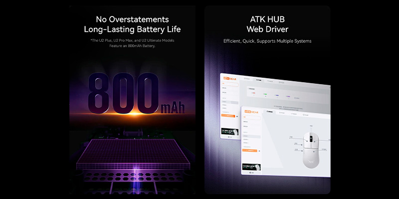 ATK trang bị cho U2 Ultimate viên pin 800mAh, cho thời gian sử dụng cực lâu lên tới 240 giờ ở chế độ NearLink, hoặc 150 giờ ở 1000Hz, đáp ứng hoàn hảo nhu cầu chơi game cường độ cao. Công nghệ tiết kiệm năng lượng thông minh giúp duy trì hiệu năng cao mà không làm hao pin nhanh. Khi cần, người dùng có thể tiếp tục sử dụng qua chế độ có dây Type-C, không làm gián đoạn quá trình thao tác. Thời lượng pin ấn tượng cùng khả năng hoạt động ổn định giúp chuột trở thành vũ khí đáng tin cậy trong mọi trận đấu kéo dài.