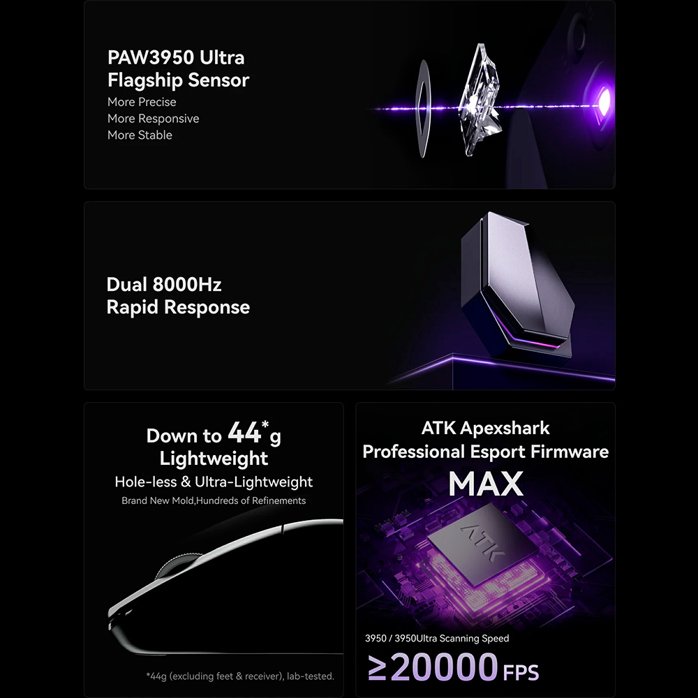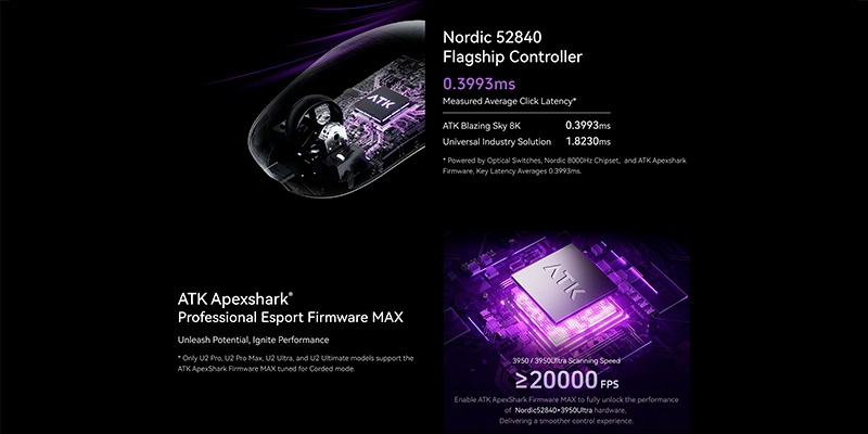 Điểm nổi bật nhất của ATK Blazing Sky U2 Ultimate chính là cảm biến PixArt PAW3950Ultra đời mới, thuộc nhóm flagship cao cấp nhất trên chuột gaming hiện nay. Cảm biến này mang lại độ chính xác vượt trội, khả năng tracking tốc độ cao và ổn định tuyệt đối trên mọi bề mặt. Kết hợp với MCU Nordic 52840 hiệu suất mạnh, chuột đảm bảo độ phản hồi cực nhanh, độ trễ cực thấp và khả năng xử lý chuyển động mượt mà trong các tựa game FPS đòi hỏi độ chính xác tuyệt đối. Đây là lựa chọn lý tưởng cho game thủ chuyên nghiệp, người cần sự ổn định trong từng pha flick, tracking hay headshot liên tục.