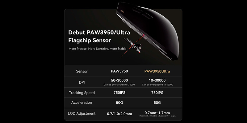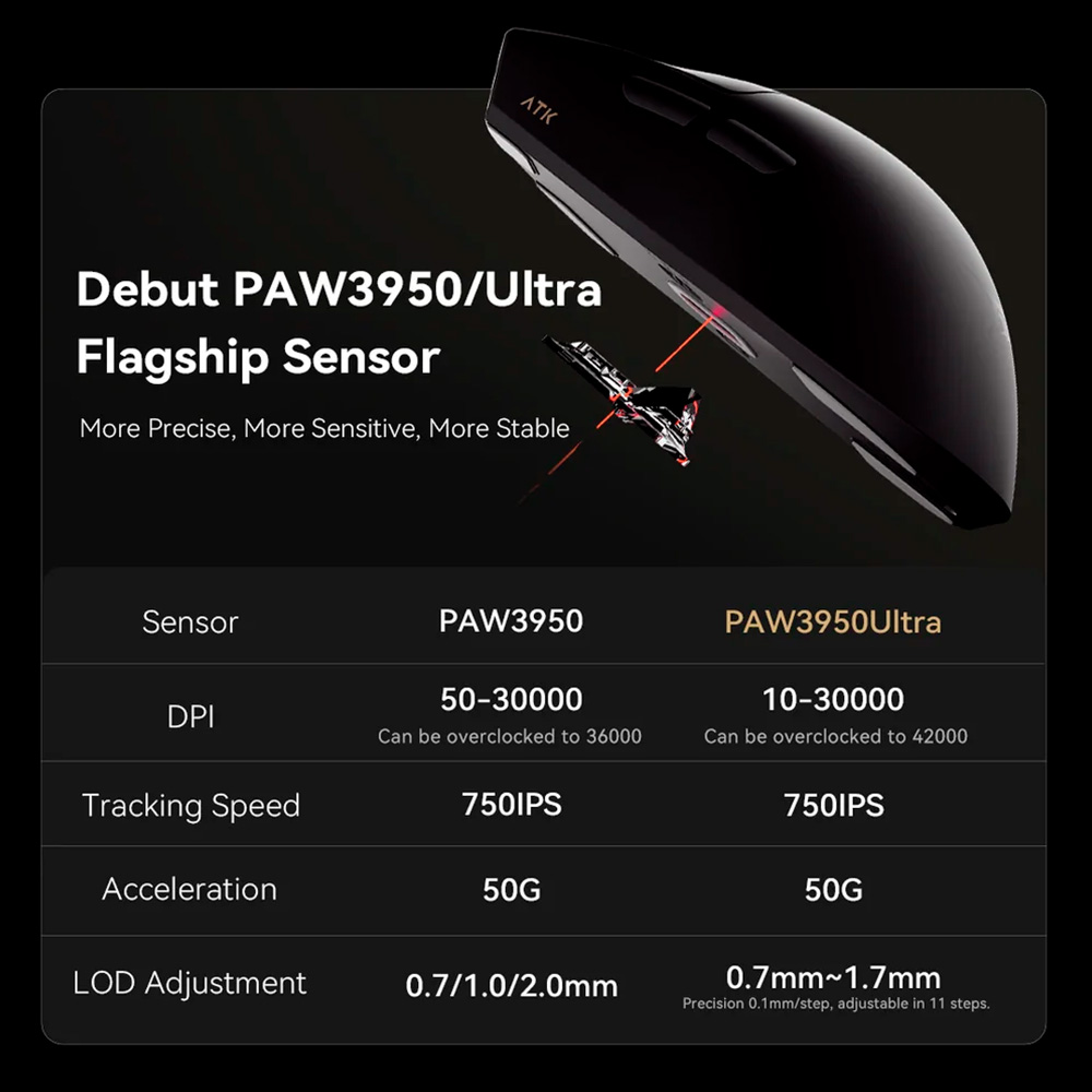 Trang bị cảm biến quang học PixArt PAW3950 cao cấp, ATK Blazing Sky X1 Pro đạt hiệu năng đỉnh cao với khả năng tracking mượt mà và độ nhạy cực kỳ chính xác. Cảm biến này hỗ trợ DPI tối đa 30.000, mang lại tốc độ phản hồi cực nhanh và độ ổn định vượt trội, phù hợp cho cả game FPS tốc độ cao lẫn công việc đòi hỏi độ chính xác tuyệt đối. Với công nghệ xử lý tín hiệu tiên tiến, chuột có thể duy trì độ chính xác ổn định ngay cả khi di chuyển nhanh hoặc thực hiện các thao tác yêu cầu tốc độ cao.
