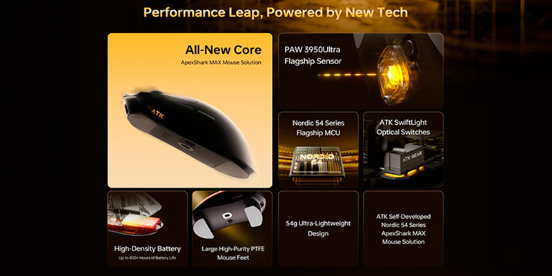 Trả lời: Bạn hoàn toàn yên tâm. Đội ngũ kỹ sư của ATK đã tính toán kết cấu vật lý vô cùng kỹ lưỡng. Dù mang viên pin 800mAh nhưng tổng trọng lượng chỉ 54g và trọng tâm chuột được đặt ở vị trí cân bằng hoàn hảo (center of gravity), giúp bạn nhấc và hạ chuột cực kỳ thoải mái mà không hề bị chúi đầu hay xệ đuôi.