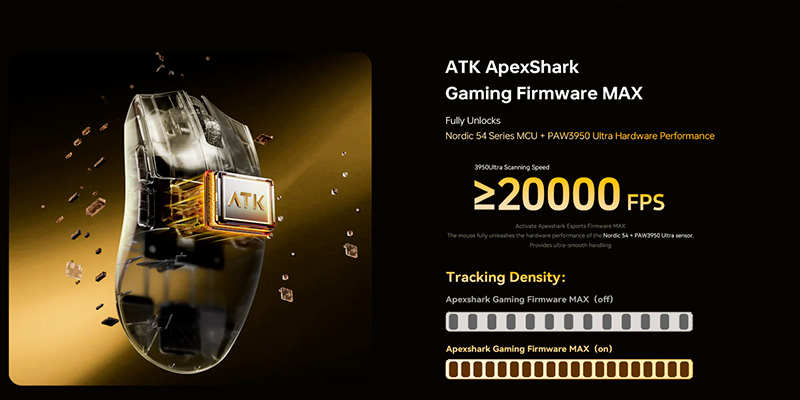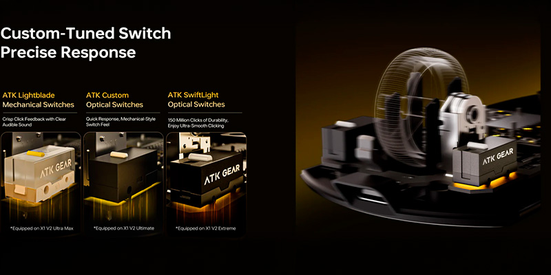 Nhằm mang lại cảm giác nhấn (click) sắc bén và tốc độ phản hồi ánh sáng, ATK đã trang bị cho chuột hệ thống switch quang học ATK Custom Optical độc quyền. Việc sử dụng tín hiệu hồng ngoại thay cho lá đồng cơ học giúp loại bỏ hoàn toàn nguy cơ click đúp (double-click) đầy khó chịu. Từng cú click giờ đây đều cực kỳ giòn giã, nảy và dứt khoát, mang lại lợi thế quyết định trong những pha đấu súng 1vs1 căng thẳng.
