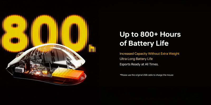 Dù mang trong mình sức mạnh phần cứng "khủng long", thiết bị vẫn sở hữu viên pin sạc dung lượng lớn 800 mAh. Được tối ưu hóa điện năng xuất sắc, chuột có thể hoạt động liên tục hơn 800 giờ (khi sử dụng ở mức Polling Rate 1000Hz). Bạn có thể tự do tùy chỉnh các thông số chuyên sâu thông qua phần mềm ATK HUB 3.0 tương thích đa nền tảng (Windows, MacOS, Linux). Hộp sản phẩm cũng đi kèm bộ phụ kiện vô cùng chu đáo bao gồm dán chống trượt (Grip Tape) và bộ feet chuột Gray Double-Layer Anti-Dent cao cấp, mang lại trải nghiệm lướt chuột êm ái nhất ngay từ lúc bóc seal.