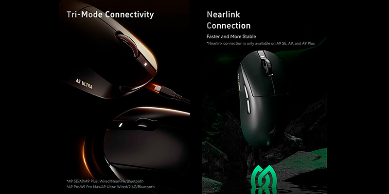 Chuột không dây ATK Dragonfly A9 Plus Tri-mode Wireless Pixart 3395 hỗ trợ ba chế độ kết nối gồm NearLink, Bluetooth, và kết nối có dây Type-C, đáp ứng đa dạng nhu cầu cả chơi game và làm việc. Chế độ NearLink mang lại độ trễ thấp, phù hợp cho game thủ muốn sự ổn định tối đa. Bluetooth cho phép sử dụng A9 Plus với laptop, tablet hoặc smartphone vô cùng tiện lợi. Kết nối có dây giúp duy trì đường truyền liên tục ngay cả khi pin thấp, đảm bảo không bị gián đoạn trong các trận đấu căng thẳng.