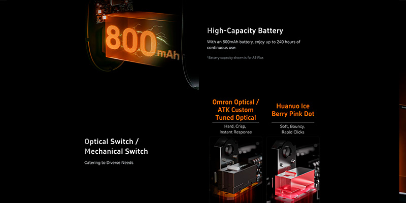 Với viên pin dung lượng 800mAh, A9 Plus mang lại thời gian sử dụng ấn tượng lên tới 150 giờ ở chế độ 1000Hz, cho phép game thủ thoải mái chiến đấu xuyên suốt nhiều ngày mà không phải lo sạc nhiều lần. Công nghệ tối ưu năng lượng thông minh giúp duy trì hiệu suất cao nhưng vẫn tiết kiệm pin, đặc biệt hữu ích khi chơi game dài giờ. Khả năng sạc nhanh và sử dụng ngay cả khi đang sạc giúp đảm bảo chuột luôn trong trạng thái sẵn sàng hoạt động.