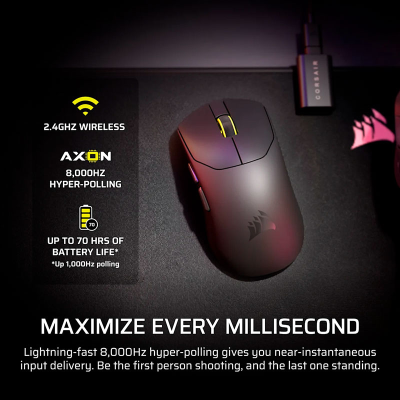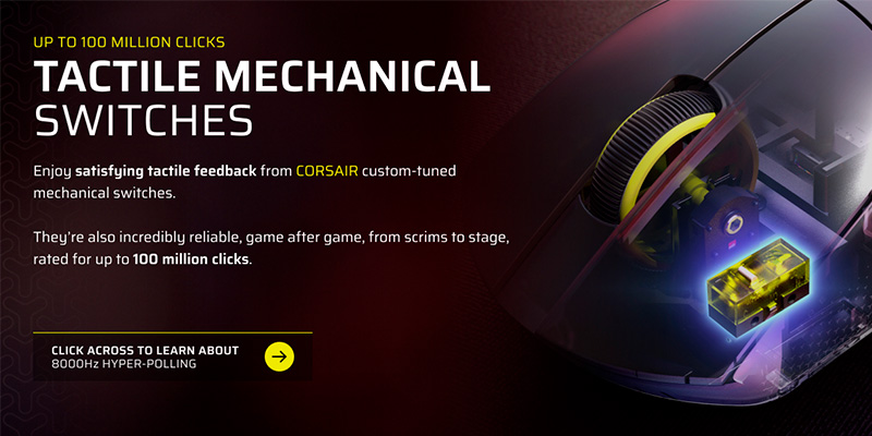Trải nghiệm nhấn chuột trên phiên bản này mang lại sự thỏa mãn xúc giác đặc biệt nhờ các switch cơ học được Corsair tinh chỉnh riêng biệt (Custom-tuned). Các switch này cung cấp phản hồi xúc giác rõ ràng, đanh gọn, giúp game thủ cảm nhận chính xác từng cú click, tránh tình trạng nhấn nhầm hoặc nhấn không ăn thường thấy ở các dòng chuột phổ thông. Về độ bền, hệ thống switch này được xếp hạng tuổi thọ lên đến 100 triệu lần nhấn, một con số khổng lồ đảm bảo sự tin cậy tuyệt đối qua hàng ngàn trận đấu, từ những buổi tập luyện (scrims) căng thẳng cho đến ánh đèn sân khấu của các giải đấu lớn. Sự ổn định trong cảm giác nhấn giúp duy trì phong độ thi đấu đỉnh cao của game thủ trong suốt vòng đời sản phẩm.